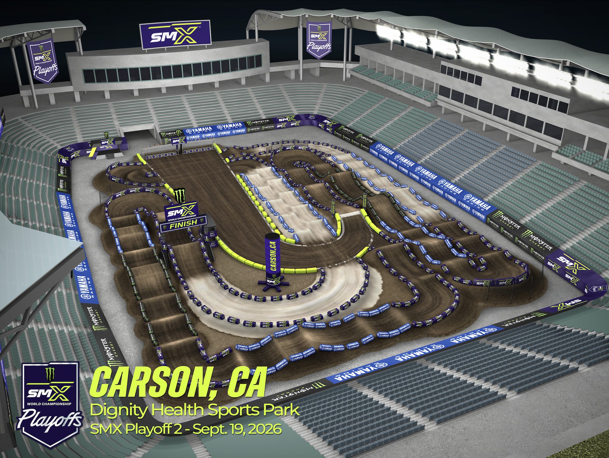 The 2026 Playoffs will feature three all new locations in 2026. Playoff 1 will take place on Saturday, September 12 at Historic Crew Stadium in Columbus, Ohio. Playoff 2 will take place on Saturday, September 19 at Dignity Health Sports Park in Carson, California and the SMX World Championship Final will take place on Saturday, September 26 at Thunder Ridge Nature Arena in Ridgedale, Missouri.