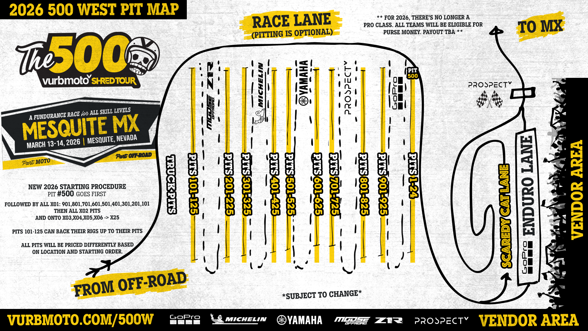 Pricing has changed this year. It’s a bit more complicated than this, but know the better the starting position, the more your spot costs. (Of note: Your Pit Location is your Entry Fee for the event. If you did not select and pay for a Pit Location, your registration is not complete.) But now there’s no pro class. Everyone is eligible for the purse in the overall ranking. Part of the price increase will go into the purse. Details on that later. If you have questions, let us know at [email protected] and we’ll get you dialed.