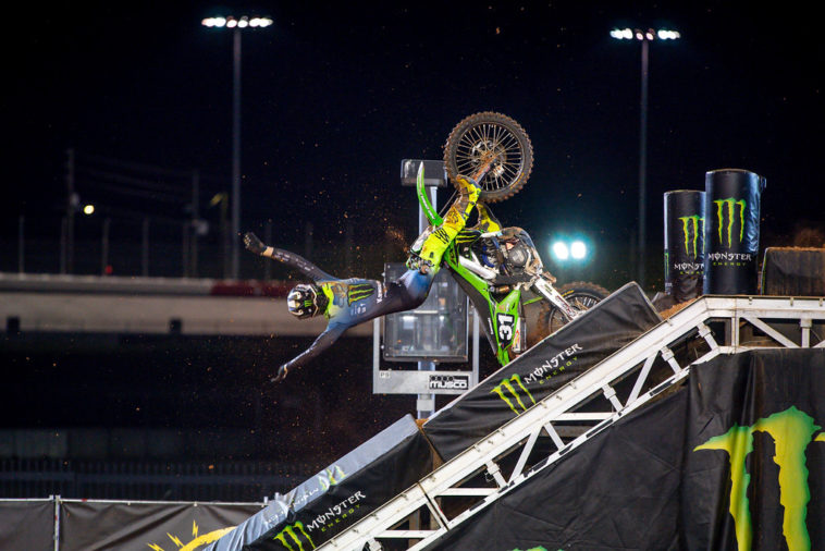 “The crash was obviously crazy,” he said after Atlanta 2. “I just re-saw it. I hit my leg really, really bad and I couldn’t move it. I was struggling to get my leg back moving. I was doing my best to get up. I was wanting to go back to my bike. I had the medics kind of tell me, “You probably shouldn’t.” I was like, “No. I want to go back.” Then they helped me down the jump. I was telling them stop. But I got back to my bike after they red flagged it and rode back and just told them I want to race, I’m okay. Obviously [Doctor] Bodnar came over and they checked me out thoroughly because they were concerned about my head. I passed all the tests. My bike was mangled, so the mechanics did the best they could. [Laughs] They were taping shrouds on, zip-tying stuff because everything fell apart. My bars were really rolled back and pretty bent, but I didn’t even really realize that so much until I came around the first turn. I don’t think I got the holeshot, but I was leading. It was tough. It was a tough race. About five minutes in when the adrenaline kind of wore off, I really realized how beat up I was. I’m pretty sore now.”