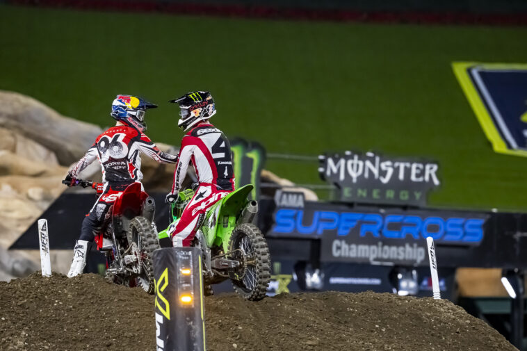 Sexton: I mean, yeah, I qualified fastest, but I didn’t finish the last session. It was a little bit unfortunate going down in the whoops. I was pretty upset with myself. I couldn’t finish the practice because my bars were bent, so I just went back. And then the heat race felt good again and went down. I was just like, “This can’t be happening.” I feel like I’ve been fighting an uphill battle a little bit the last… Well, honestly, since SMX. So, this one feels good to finally break through. Yeah, it feels like I haven’t won in a very long time, and it feels good to get the first one for the team. They’ve been working their butts off. Made some really good changes.
