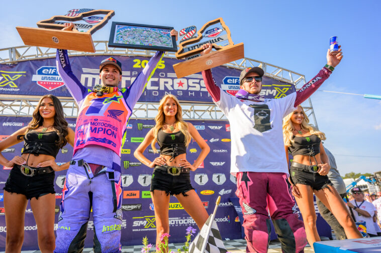 Honda HRC Progressive’s Jett Lawrence continues to climb the record books. In just his third year in the 450 Class (really two and half, as he missed time in 2024) the Australian can already lay claim to a perfect season (as a rookie in 2023) and now two titles (2023 and 2025).