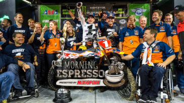 Following 8-3 finishes at the previous two rounds, Tomac’s win, coupled with Cooper Webb’s second place finish, puts the duo in a tie in points through 10 rounds.