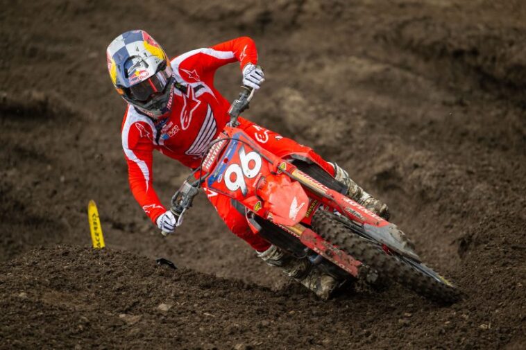 After winning the first moto, Honda HRC’s Hunter Lawrence went down on the start of the second moto and was taken by cart to the Alpinestars Mobile Medical Unit.