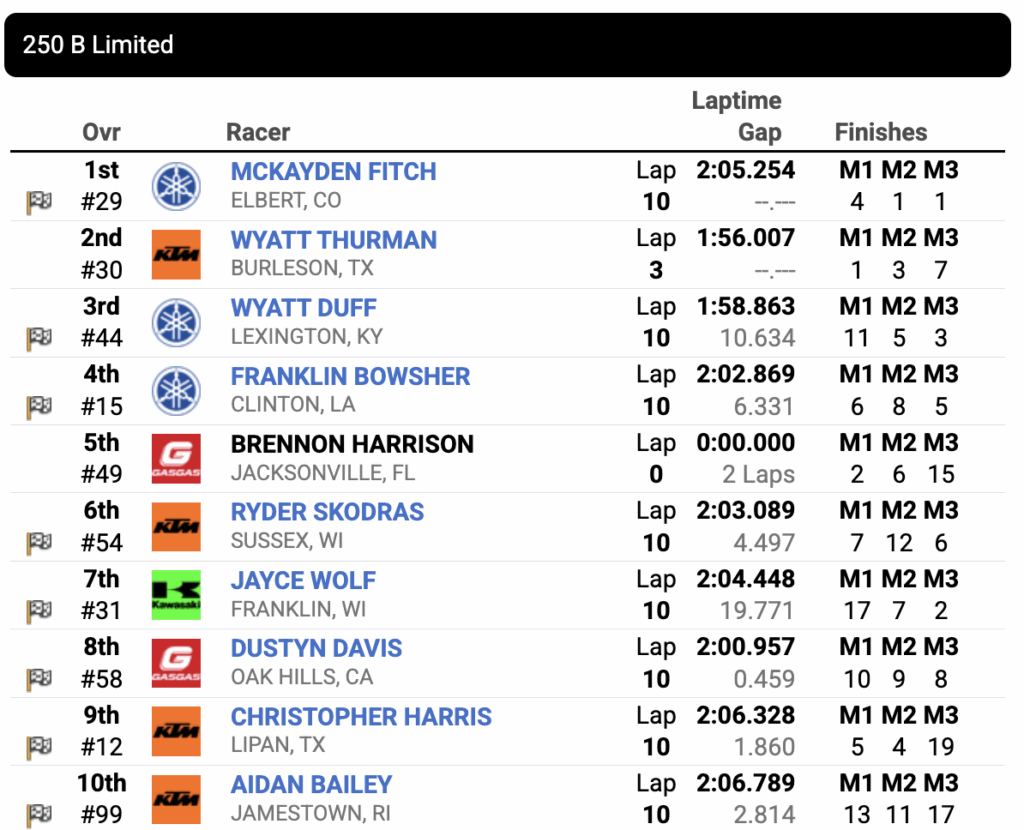 MADNESS at the Ranch in the final 250 B Limited moto. Max Shane, McKayden Fitch and Wyatt Thurman all had a shot at the title entering the third and final moto and they ran 1-2-3 early with Shane leading over Fitch and Thurman.