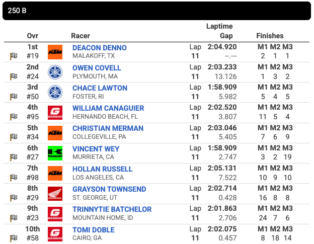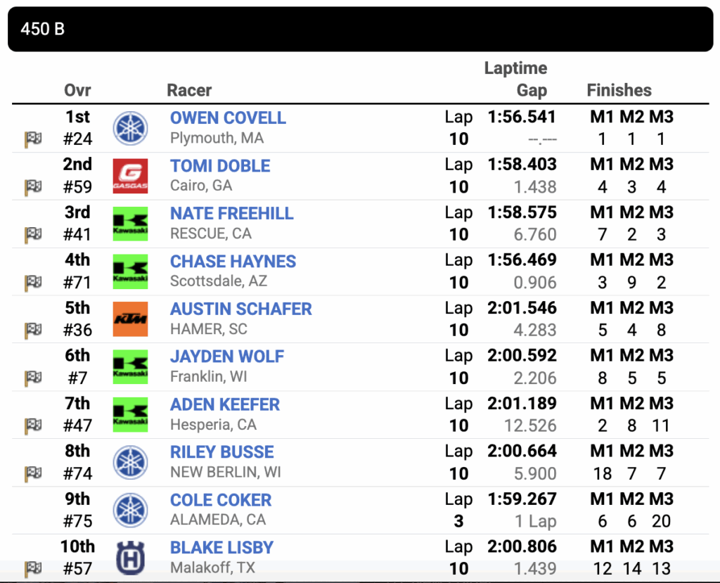 Meanwhile, Covell was on the charge late in the moto and go around Freehill and lead Haynes to take his third moto win of the week and the title.