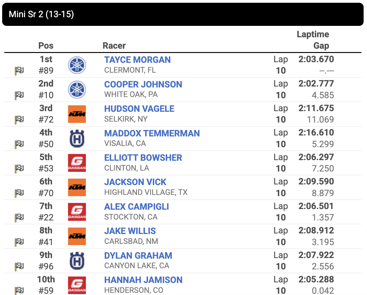 Alex Campigli grabbed the holeshot over Hudson Vagele and more. But it was quickly the Morgan/Temmerman show. Morgan was in the lead, but Temmerman was applying a ton of pressure. He finally got around, but tipped over shortly after, heading the lead and the championship to Morgan.