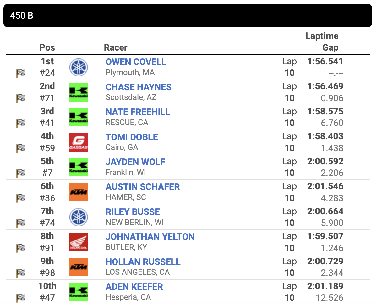 Covell took second over Carson Wood, who charged from way back to snag the final podium spot.