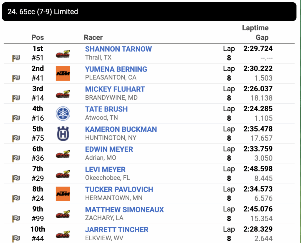 Ezra Hastings and Luke Vonlinger would round out the top 5. ClubMX training facility owner Brandon Hass finished sixth after starting up front.