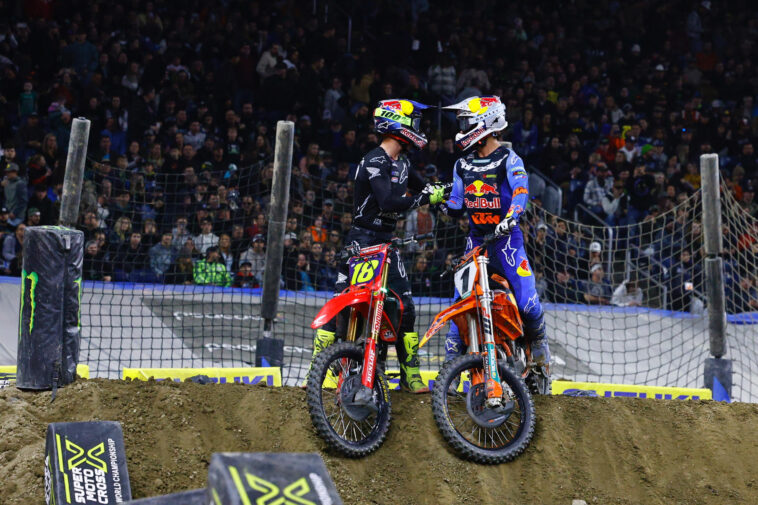 Triumph Factory Racing’s Evan Ferry was involved in the first turn pile up along with Seth Hammaker, Tom Vialle, Cameron McAdoo, Haiden Deegan, Nick Romano, Pierce Brown, Jalek Swoll, Cullin Park, Bryton Carroll, and Gage Linville. We’re waiting on updates from these riders as well.