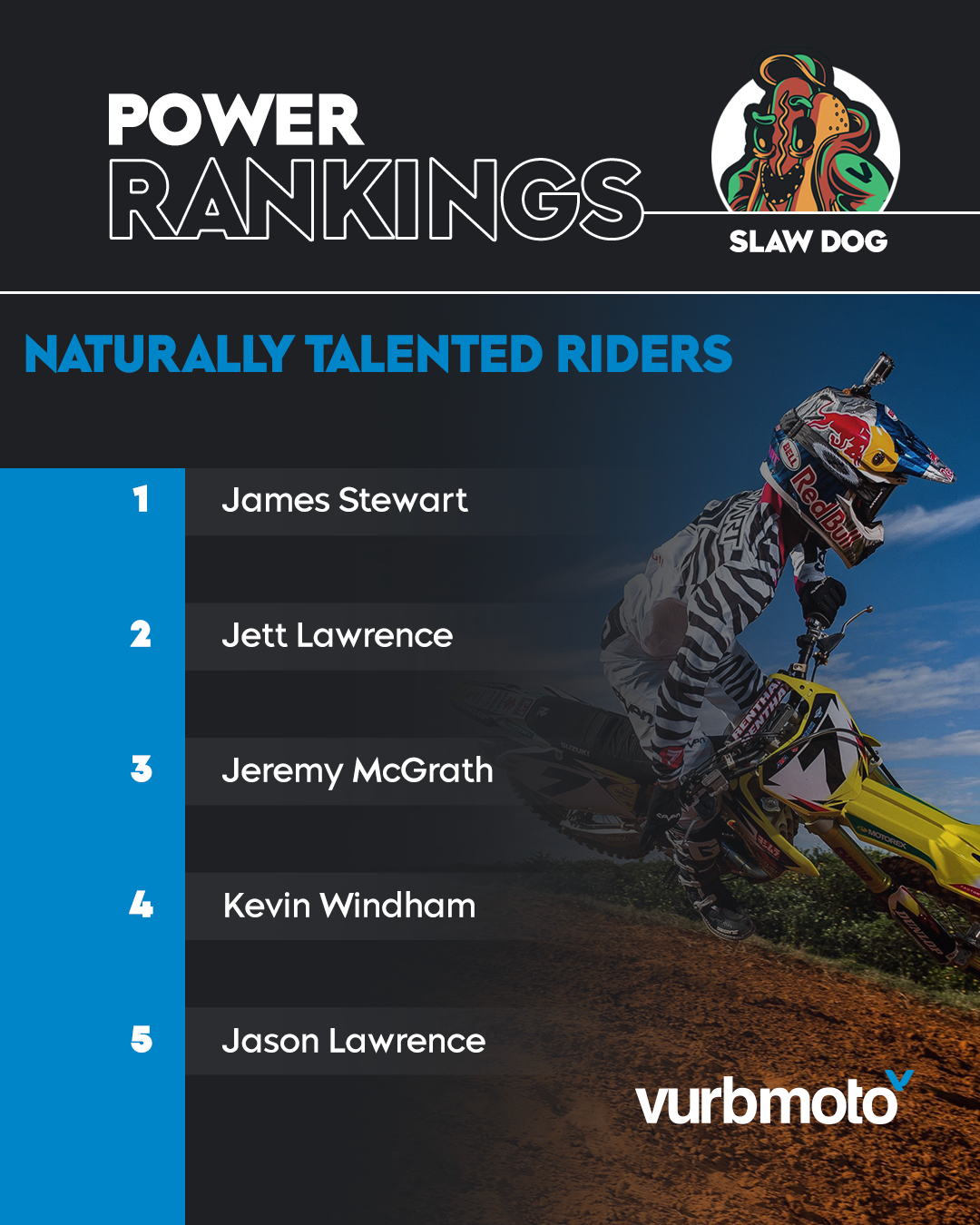 Since it’s the off-season we decided to change things up a bit in the Guts Racing Vurb Power Rankings. Going forward, Slaw and Troy will be ranking different topics until racing starts again at Anaheim. Ginger Dog is currently breaking up fights in middle school for the next few months and will rejoin the rankings once racing starts.