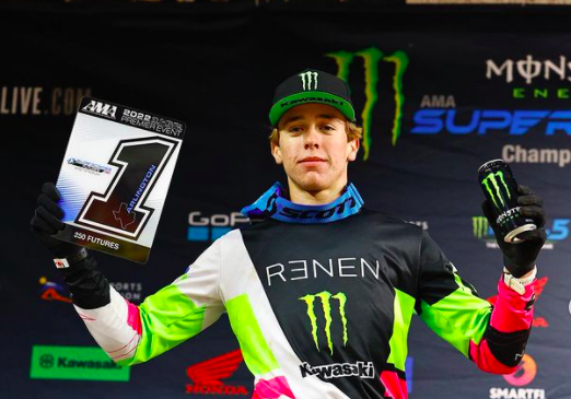 Team Green Kawasaki’s Ryder DiFrancesco won his fourth straight Supercross Futures main event on Saturday in Arlington, edging out Honda HRC’s Chance Hymas.
