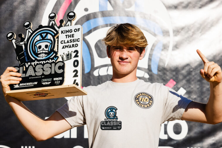 For 2024, with a 1.25 finishing average, we present you our MX Trophies King of the Classic, Ryan Sampson. With a perfect day in 250 C and 450 C on Saturday, followed by 1-2, 1-2 scores on Sunday, Ryan did exactly what he needed to do to keep that finishing average low – WIN. Every single year we typically have standouts in every class that seem to make their sweeps, and the math for KoC contention actually becomes complex. But this year it seemed the raw amount of talent in all the classes kept things mixed up, and despite losing two motos to Cooper Bergeron on Sunday, Ryan captured our highest award from the Vurb Classic.